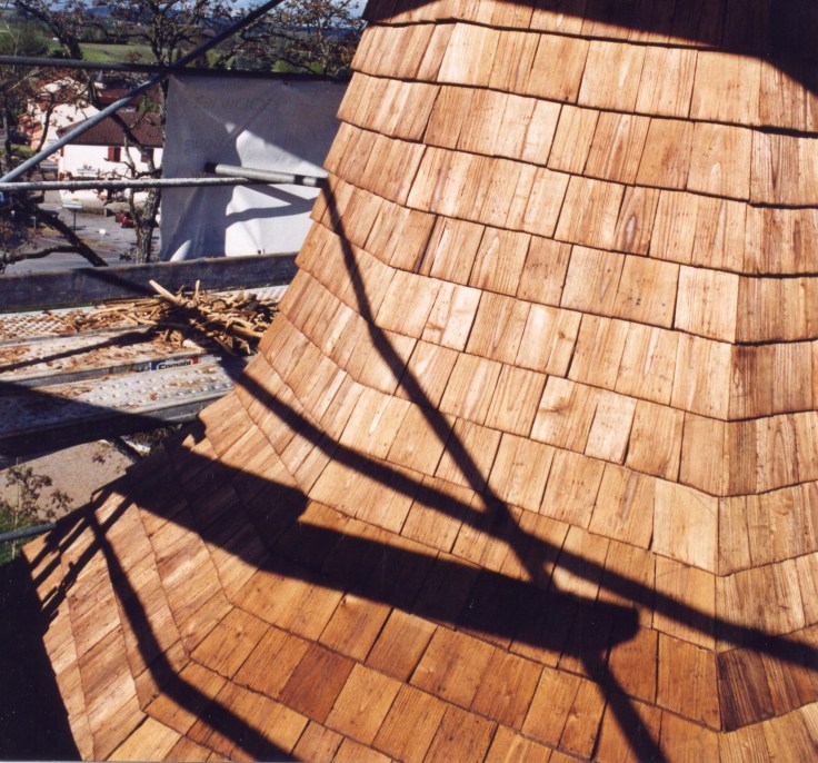 Auparavant recouvert d’ardoises, le clocher quadrangulaire, surmonté d’une flèche octogonale est aujourd’hui recouvert de bardeaux de châtaignier (10500 bardeaux fixés par 21000 clous en cuivre).