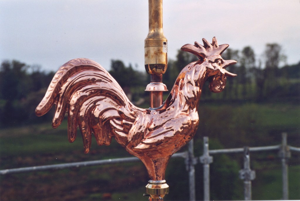 Il est surmonté d’un coq girouette en cuivre.